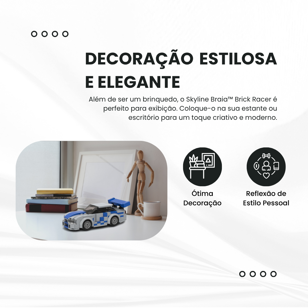 Claro! O Blockline GT-R é uma peça de exibição incrível, perfeita para deixar na sua estante ou mesa, mostrando o design detalhado e icônico do Skyline R34.
